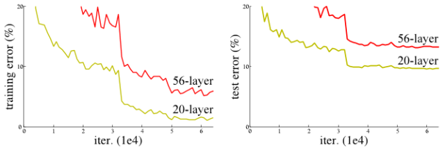 在研究一个图像识别的经典问题 CIFAR-10 的时候,他们发现一个 56层的简单神经网络,识别错误率反而高于一个20层的模型.