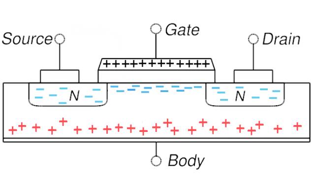 集成电路里的所谓场效应管 (Field-Effect Transistor), 主要是三个部分: 源极 (Source), 栅极 (Gate) ,漏极 (Drain)。栅极本质上是一个电容, 对其施加电压时,栅极下面的沟道 (Channel) 联通源极和漏极,晶体管开启,代表"1"的状态。电压取消时,电流降为零,晶体管关闭, 代表"0"的状态。